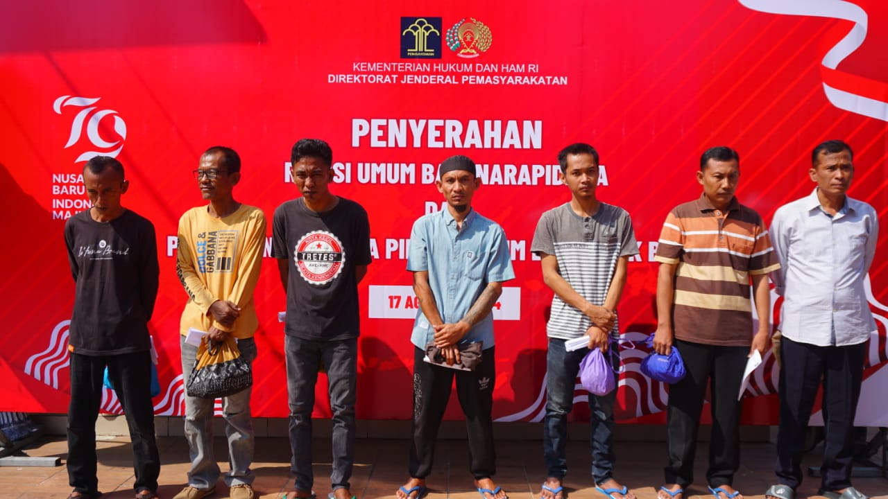 MOJOKERTO,locusdelictinews-Penyerahan remisi umum tahun 2024 kepada warga binaan Lapas Mojokerto Kanwil Kemenkumham Jatim dilaksanakan dalam Upacara Peringatan HUT Kemerdekaan Republik Indonesia ke-79 di Lapangan Gelora Ahmad Yani Sabtu Pagi (17/08/24).