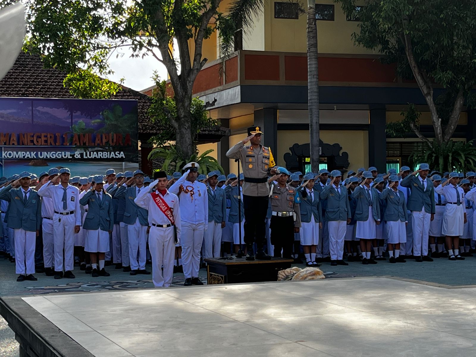 Bali,locusdelictinews-Kapolres Karangasem AKBP I NENGAH SADIARTA, S.I.K., S.H., M.K.P., tiba di SMA N 1 AMLAPURA untuk melaksanakan kegiatan police Goes To School yang disambut oleh Kepala Sekolah SMA N 1 AMLAPURA Drs. I Ketut Marta Ariana, M.Pd.H.Senin (21/10/2024 )