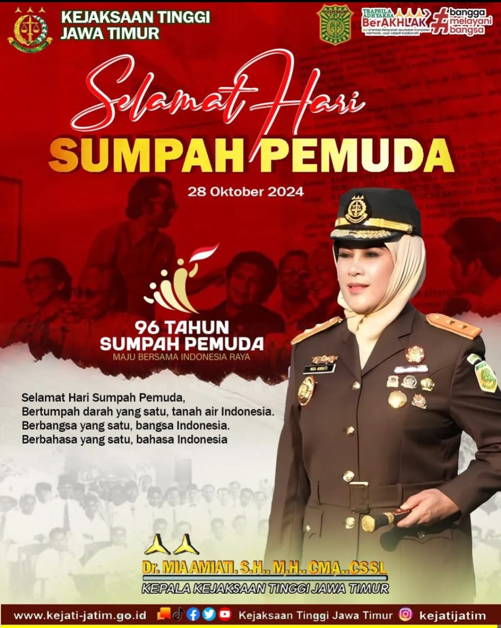 Kajati Jatim Mia Amiati mengatakan setiap tanggal 28 Oktober diperingati sebagai Hari Sumpah Pemuda yang tidak hanya merepresentasikan perjuangan para pemuda, melainkan hasil perjuangan seluruh masyarakat Indonesia.