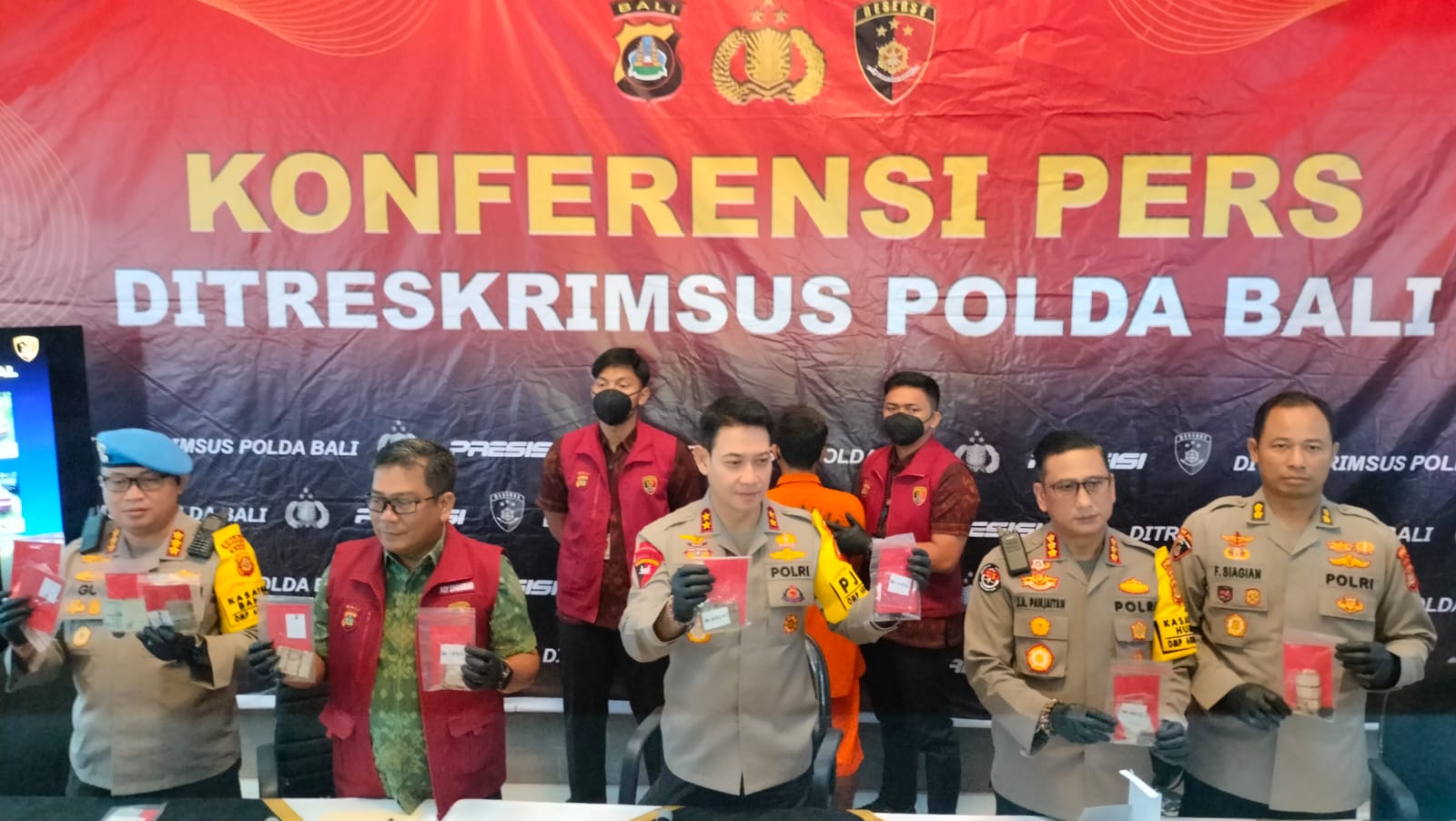 Bali, Locusdelictinews-Saat pres release di lobi Ditreskrimsus Kapolda Bali Irjen Pol Daniel Adityajaya S.H., S.I.K., M.Si., didampingi Direskrimsus Kombes Pol Roy H.M. Sihombing S.I.K., Kabid Humas Kombes Pol Jansen Avitus Panjaitan S.I.K., M.H., Kabid Propam Kombes Pol Ketut Agis Kusmayadi S.I.K., dan AKBP Siagian Staf Ahli Kapolda, pada selasa 5/11/2024.