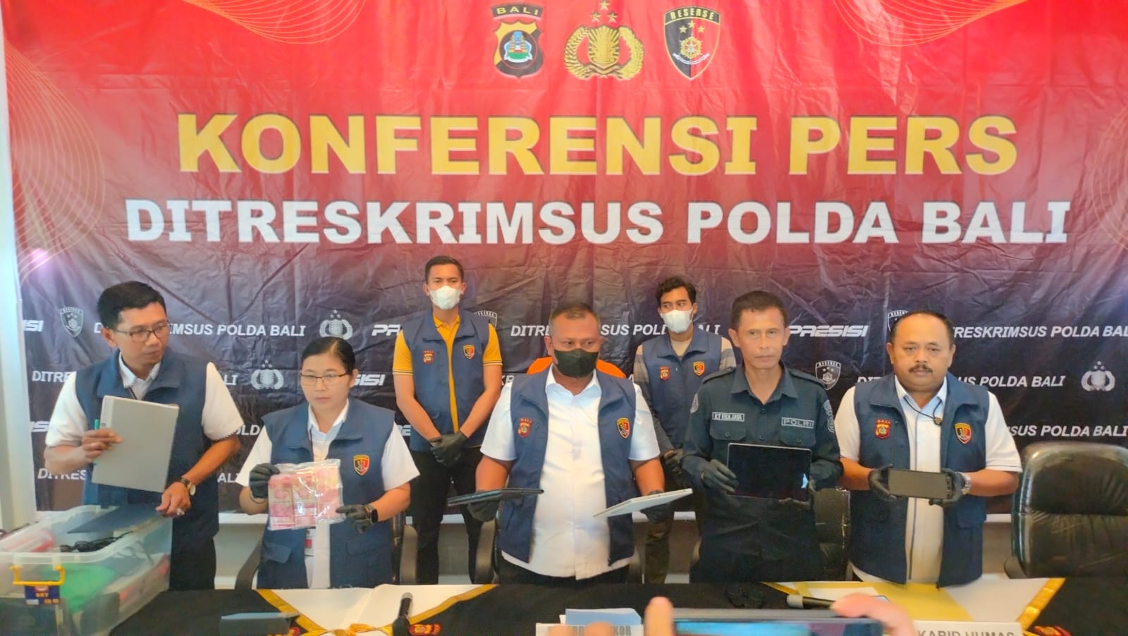 Bali,locus.febry.my.id/-Saat Press Release didepan awak media di loby Krimsus, Kasubdit Tipikor Ditreskrimsus Polda Bali AKBP M. Arif Batubara, S.H., S.I.K., M.H., Kabagbinopsnal AKBP NS. Ni Nyoman Yuniartini, S.Kep., Iptu Made Murda dan IPDA si Ngurah Putu Kusumayadi, S.H., M.H., serta Kasubid Penmas Bidhumas AKBP Ketut Ekajaya S.Sos., M.H., menerangkan telah melakukan OTT terhadap seorang oknum kepala desa Bongkasa, rabu 6/11/2024.