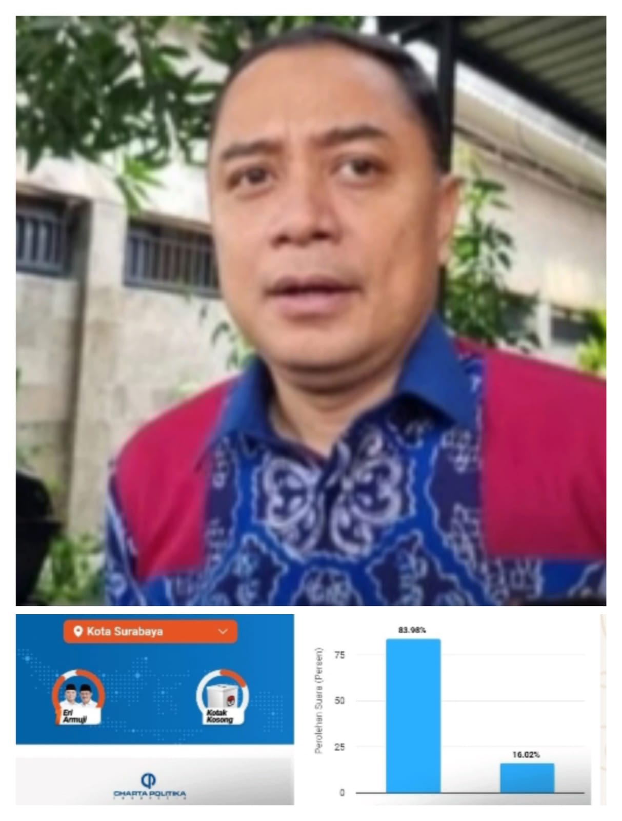 Surabaya, locus.febry.my.id/. Berdasarkan hasil quick count dengan 100 persen suara, pasangan Eri-Armuji memperoleh suara 83,98 persen mengalahkan kotak kosong yang hanya memperoleh suara 16,02 persen.