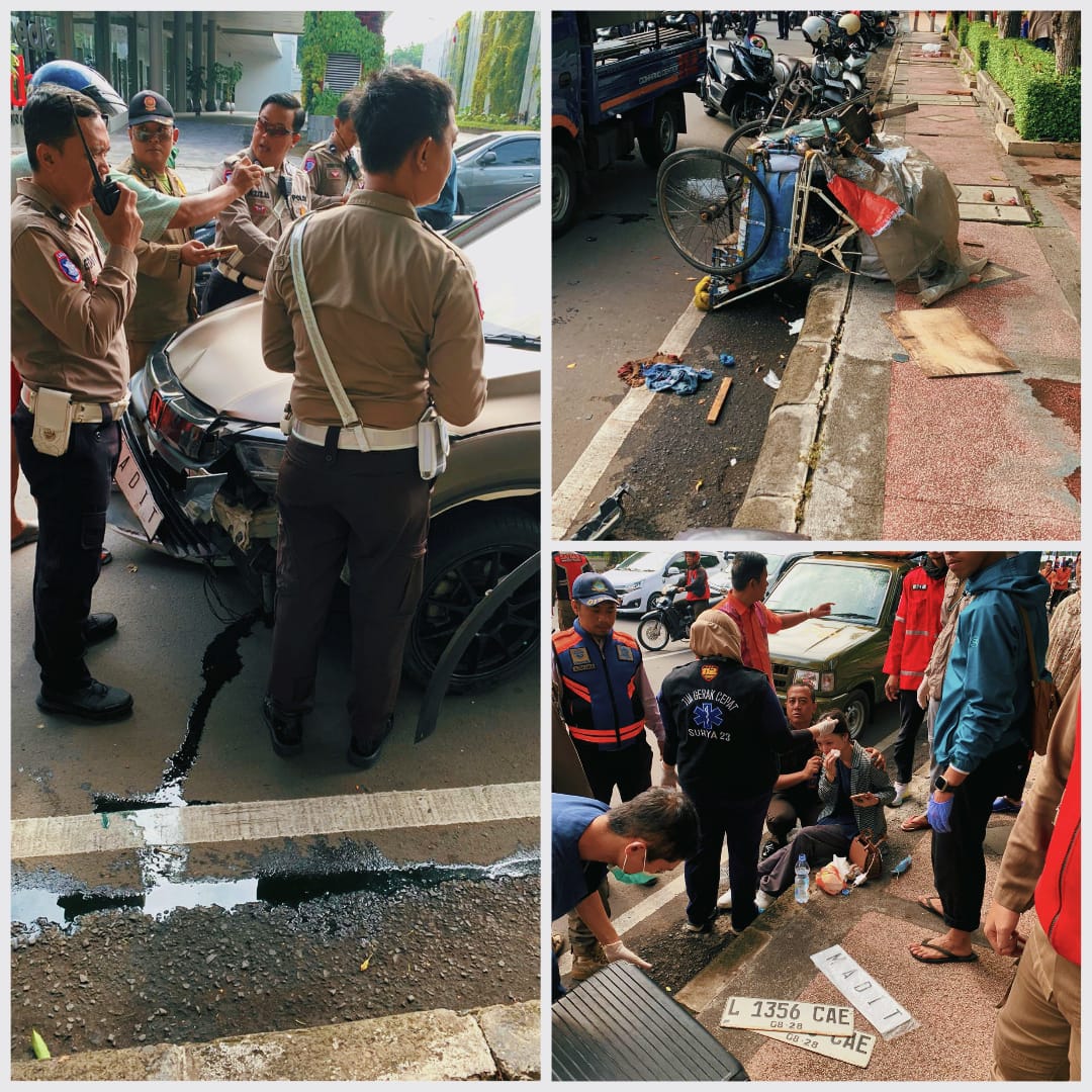 Surabaya,locusdelictinews|kecelakaan yang di sebabkan lalai kini kembali terjadi di kota Surabaya, kali ini Mobil Honda CR-V tabrak becak dan pengendara sepeda motor di jalan. Basuki Rahmad Surabaya tepatnya depan Bank Jatim,