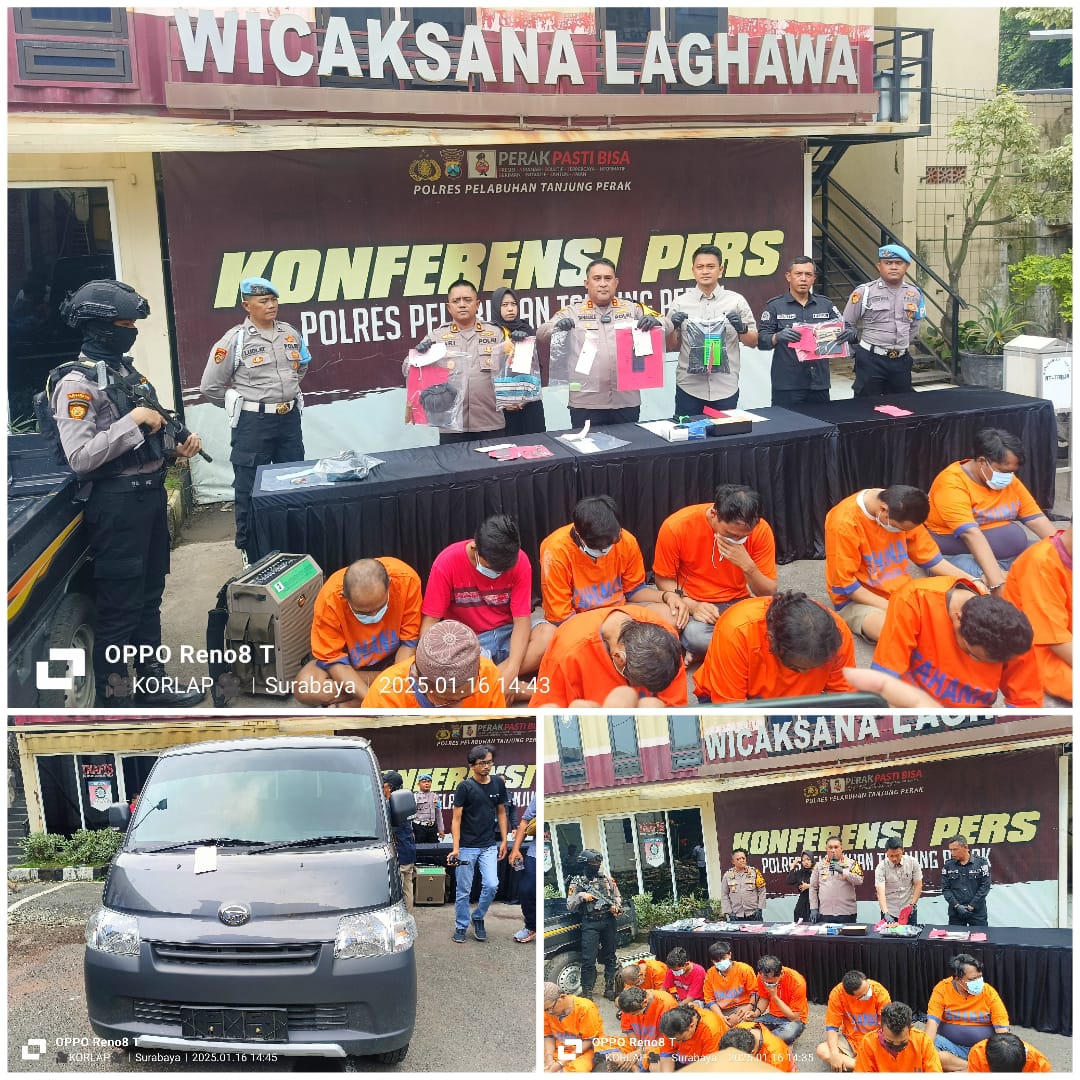 Surabaya,locusdelictinews| Bersama Polsek Jajaran Polres Pelabuhan Tanjung Perak Surabaya ungkap kasus pencurian 3C selama sebulan terahir dengan jumlah tersangka 14 orang dan 13 tempat kejadian perkara. Kamis (16/01/2025). Konferensi pers yang di gelar di Polres Tanjung Perak surabaya