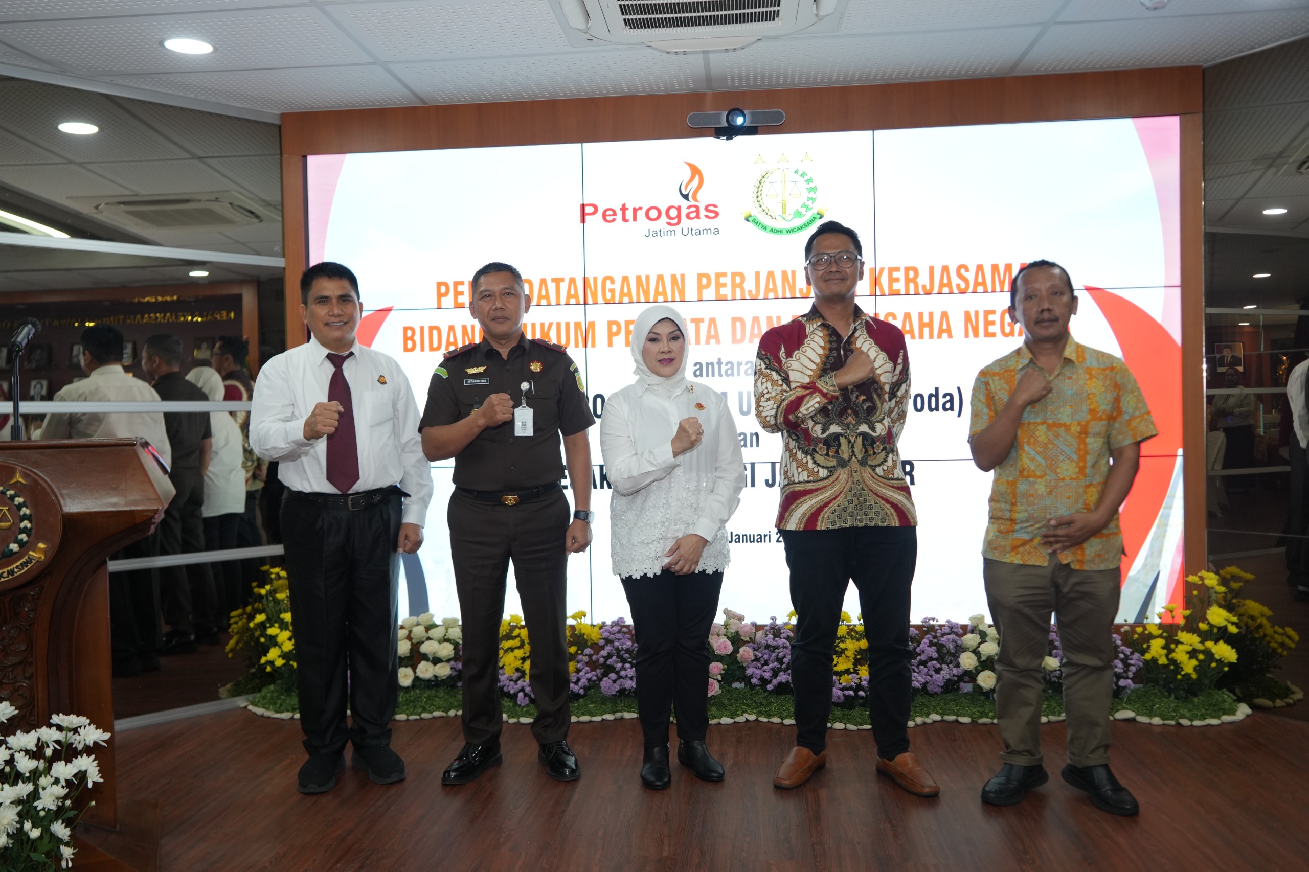 Surabaya,Locusdelectinews|Kajati Jatim Prof. (HCUA) Dr. Mia Amiati, S.H., M.H., CMA., CSSL., bertindak untuk dan atas nama Kejaksaan Tinggi Jawa Timur (Kejati Jatim) melaksanakan penandatanganan Memorandum of Understanding (MoU) atau Perjanjian Kerjasama di bidang Perdata dan Tata Usaha Negara (Datun) dengan PT. Petrogas Jatim Utama.