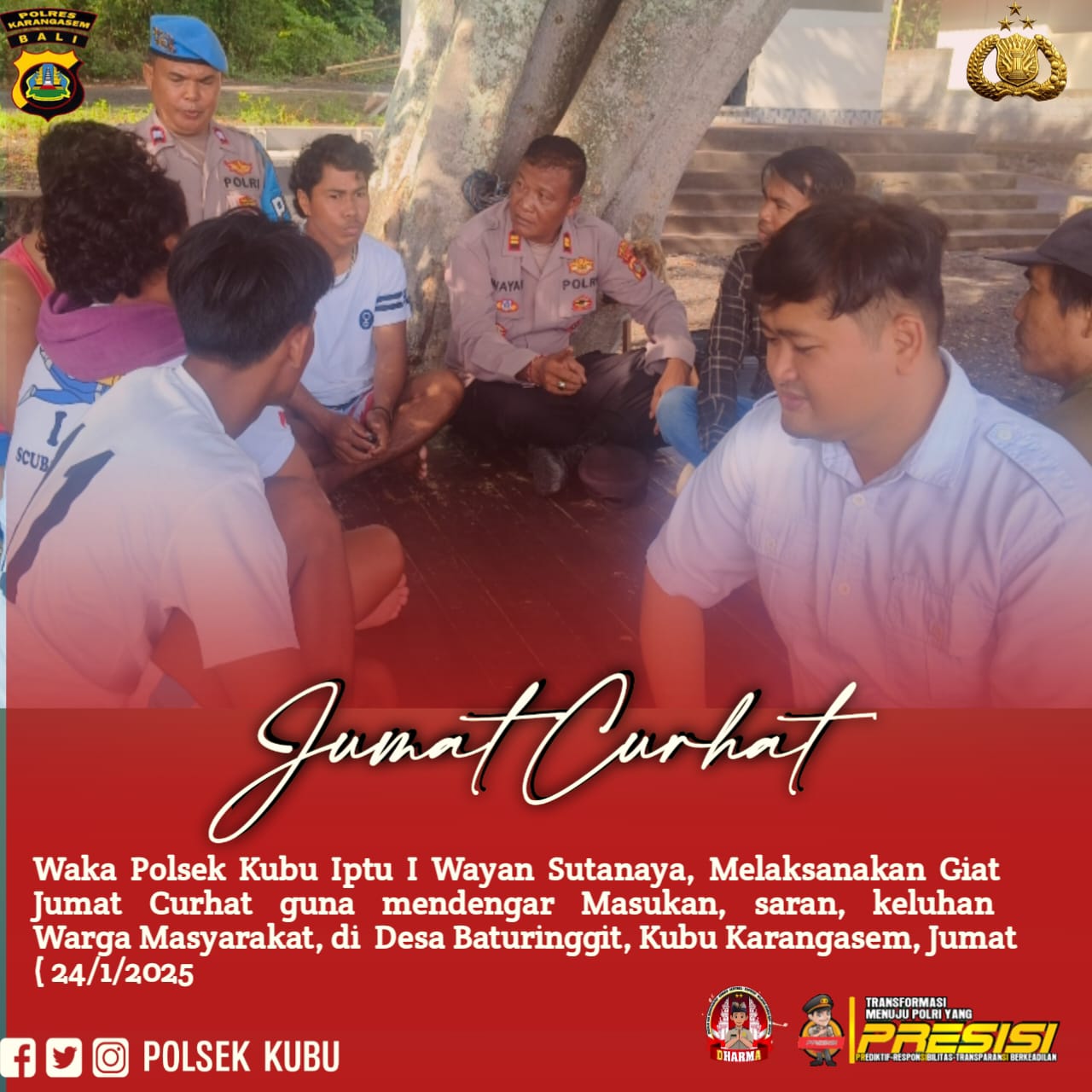 Waka Polsek Kubu menyampaikan bahwa jumat curhat merupakan salah satu Program Kapolri dalam rangka menyerap informasi, keluhan warga secara langsung terkait kamtibmas, yang nantinya keluhan masyarakat akan dijadikan evaluasi untuk melakukan langkah dan upaya pelayanan kepolian kedepan lebih baik demi menumbuhkan kepercayaan masyarakat terhadap institusi Polri.