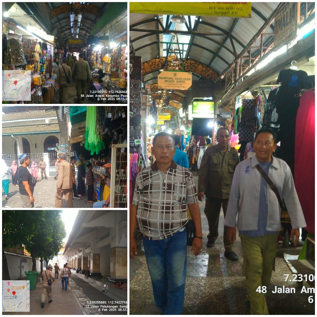 petugas gabungan melakukan patroli besar-besaran di wisata religi Sunan Ampel, Kamis (06/02/2025) patroli dilakukan sejak 09.52 WIB, petugas menyisir di setiap tempat yang diduga potensi adanya kelompok gepeng.