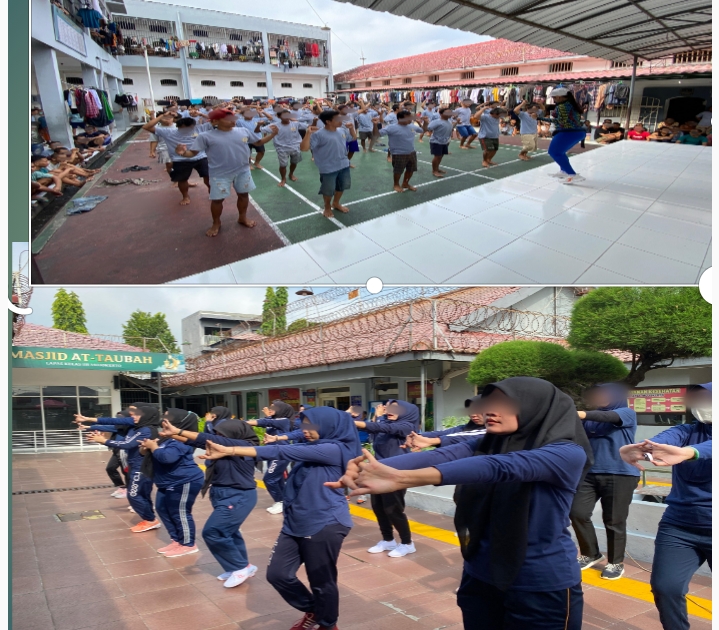 Mojokerto,locusdelictinews|Suasana penuh semangat dan keceriaan terpancar dari warga binaan Lembaga Pemasyarakatan (Lapas) Kelas IIB Mojokerto Kanwil Ditjenpas Jawa Timur saat mengikuti kegiatan pembinaan senam pagi yang digelar di area lapangan blok hunian Lapas. Kegiatan ini merupakan bagian dari program pembinaan jasmani guna menjaga kesehatan dan kebugaran para warga binaan.Di bawah arahan instruktur, warga binaan tampak antusias mengikuti setiap gerakan senam dengan penuh semangat.