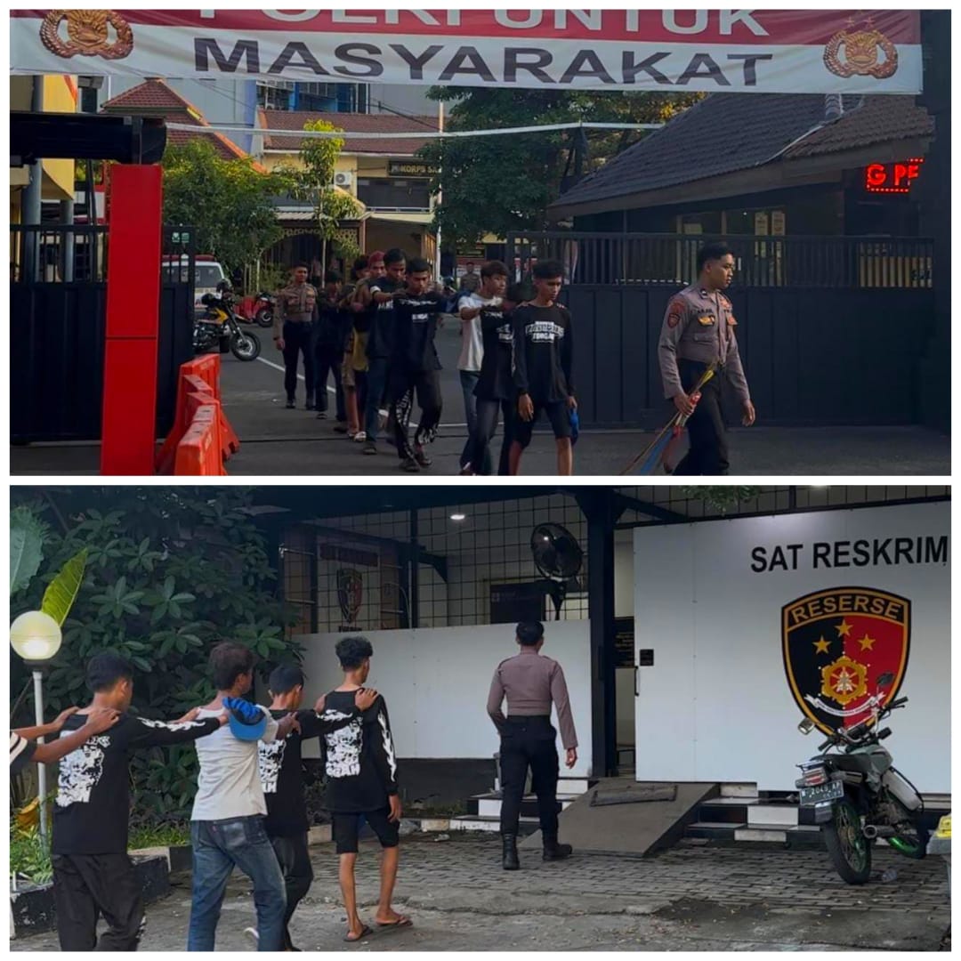 Sebanyak 11 remaja ala gengster diamankan ke Polres Pelabuhan Tanjung Perak dengan berang bukti dua buah sajam, sebuah ketapel, 1 alat panah, 10 handphone, serta 3 unit sepeda motor.