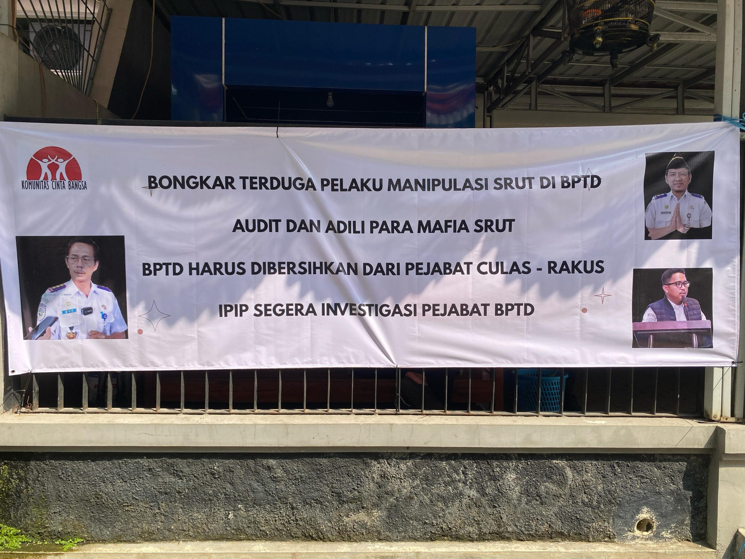 Empat banner yang dipasang di halaman kantor BPTD itu memuat pesan-pesan bernada kecaman dan desakan audit terhadap para pejabat di lingkungan BPTD Jatim. Di antaranya bertuliskan: