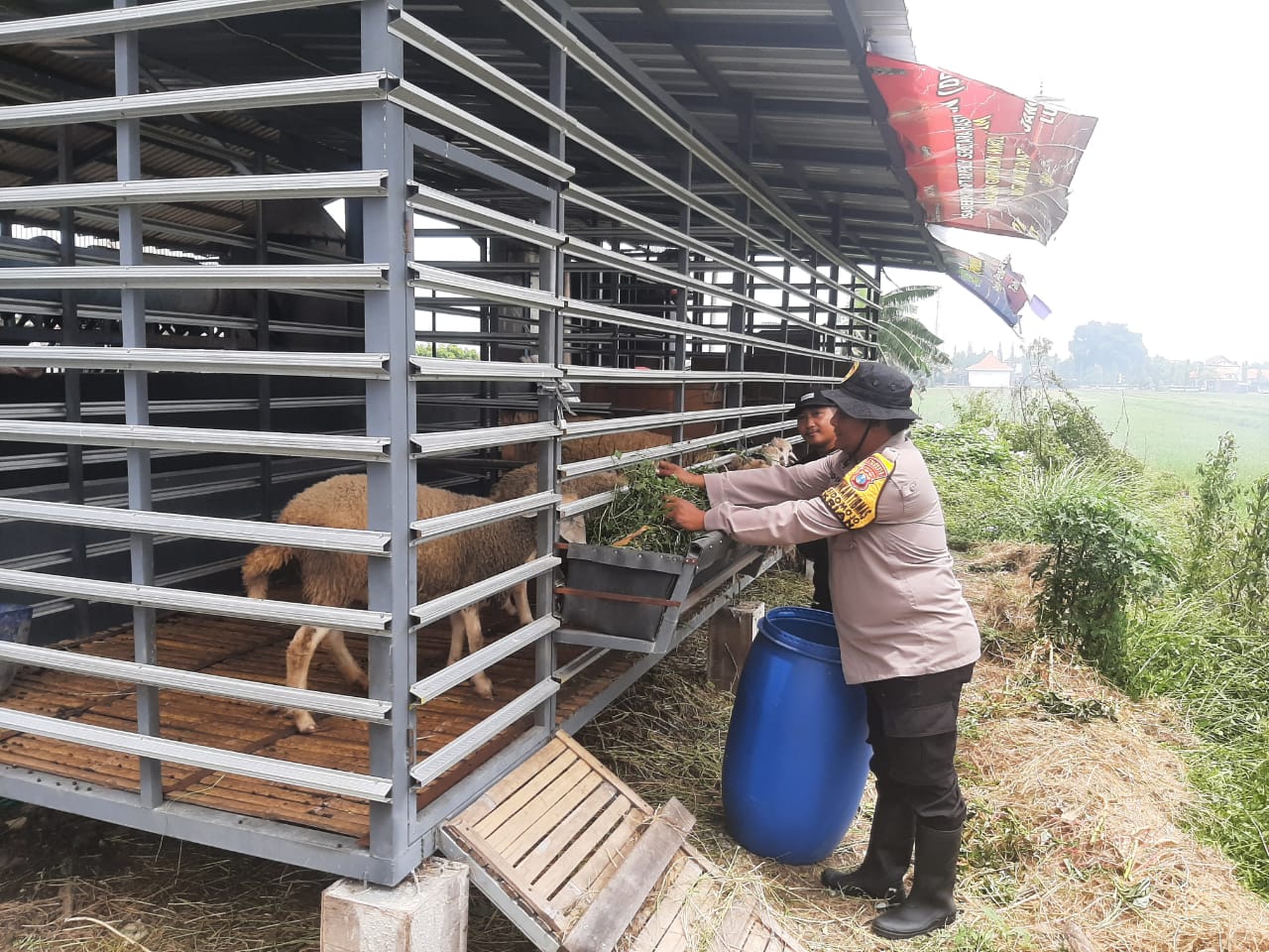 Dengan mengenakan seragam lengkap, Aipda Didik tampak berdialog langsung dengan peternak sambil meninjau kondisi kandang dan pakan ternak. Ia mengapresiasi semangat warga dalam mengembangkan usaha peternakan kambing yang tidak hanya bernilai ekonomi, tetapi juga berperan penting dalam memperkuat ketahanan pangan lokal. “Kami siap mendampingi dan mendukung kegiatan produktif masyarakat seperti ini,” ujarnya.