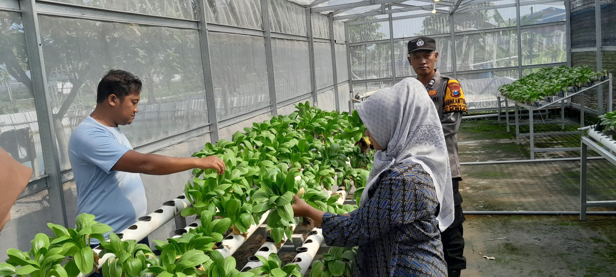 Kerian,locusdelictinews|Sebagai bentuk komitmen mendukung program ketahanan pangan nasional, Polsek Krian Polresta Sidoarjo melalui Bhabinkamtibmas Desa Ponokawan, Aiptu Iswahyudi, terus aktif mendampingi masyarakat dalam berbagai kegiatan produktif. Salah satunya adalah dengan memantau langsung perkembangan tanaman hidroponik pakcoy yang dikelola bersama warga di Desa Ponokawan, Kecamatan Krian.