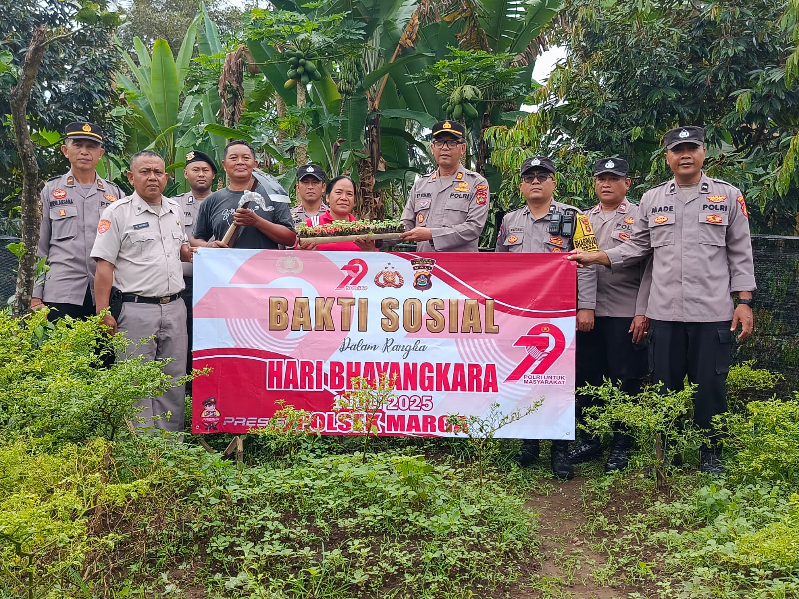 “Seijin Kapolres Tabanan AKBP Chandra C.Kesuma.,S.I.K.,M.H. Kapolsek Marga AKP I Ketut Suandi.,S.H. “Menyampaikan dalam kegiatan bhakti sosial dalam rangka hari bhayangkara ke 79, menyerahkan bantuan berupa alat pertanian berupa cangkul, sabit dan bibit cabai kepada warga masyarakat an Ni Nyoman Ruji.