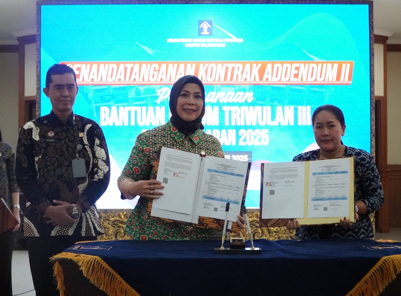 Denpasar,locusdelictinews|Kantor Wilayah Kementerian Hukum Bali melaksanakan penandatanganan Kontrak Addendum Pelaksanaan Bantuan Hukum Triwulan III Tahun Anggaran 2025 dengan 11 Organisasi Bantuan Hukum (OBH) terakreditasi di Provinsi Bali, Kamis (28/8/2025).