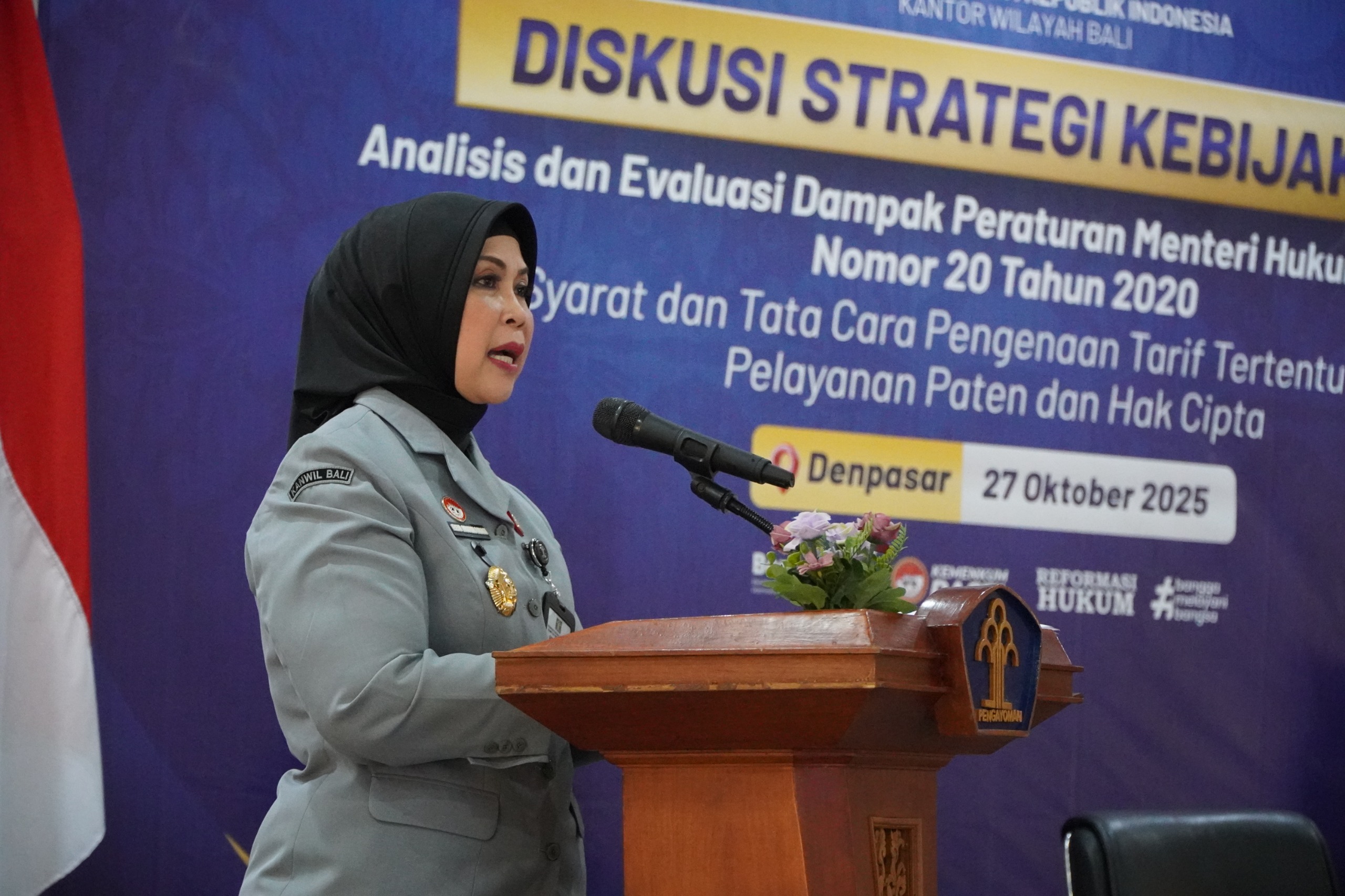 Mengawali kegiatan tersebut Kepala Kantor Wilayah Kementerian Hukum Bali, Eem Nurmanah menyampaikan bahwa diskusi ini merupakan langkah evaluatif untuk melihat kembali efektivitas kebijakan pengenaan tarif layanan paten dan hak cipta dalam kaitannya dengan perkembangan kekayaan intelektual di daerah. Eem menjelaskan bahwa tren pendaftaran paten di Bali sejak 2021 hingga 2025 menunjukkan kecenderungan menurun, meskipun pelaku inovasi lokal dan industri kreatif terus tumbuh. Karena itu, diperlukan kolaborasi kebijakan yang mendorong kemudahan dan dukungan sistemik.