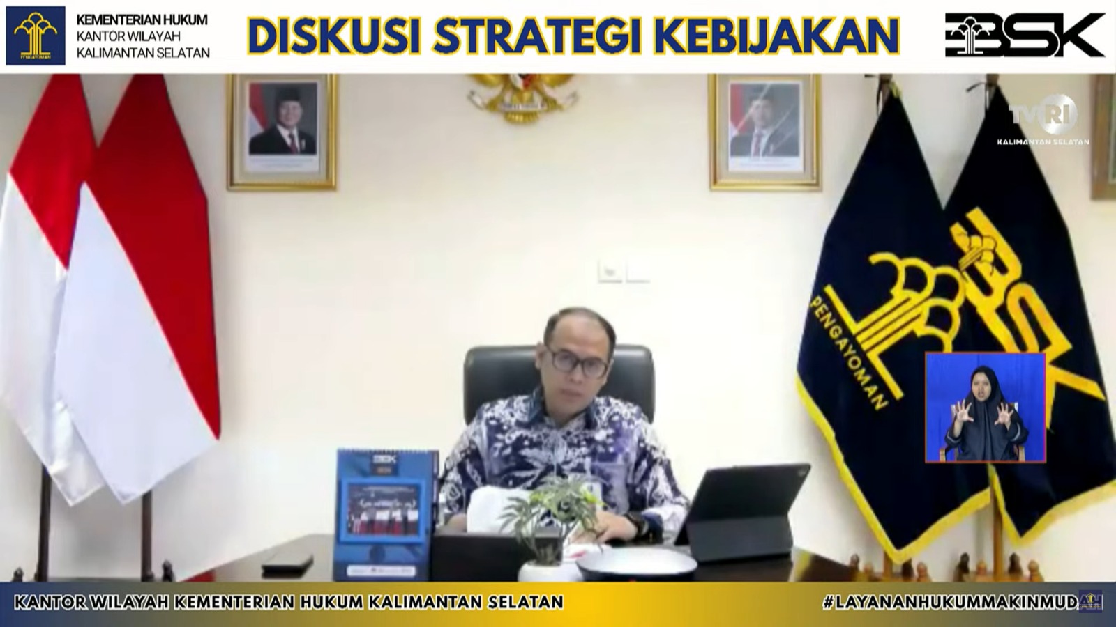 Kegiatan bertajuk “Mewujudkan Akses Keadilan di Kalimantan Selatan Melalui Standar Layanan Bantuan Hukum yang Berkualitas” ini diikuti secara virtual oleh seluruh Kantor Wilayah Kemenkum dari 33 provinsi di Indonesia.