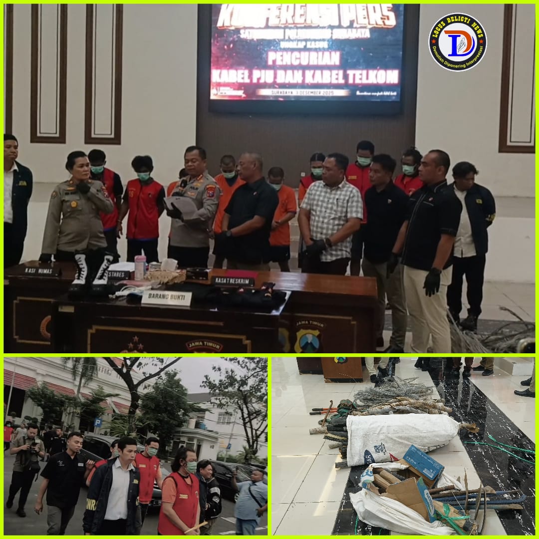 Surabaya,locusdelictinews|Satreskrim Polrestabes Surabaya mengungkap dua kasus pencurian kabel Penerangan Jalan Umum (PJU) dan kabel Telkom di wilayah Kota Surabaya. Pengungkapan tersebut disampaikan dalam konferensi pers, Rabu (03/12/2025).