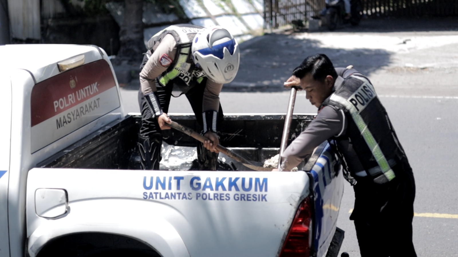 Tanpa menunggu lama, anggota Timsus Satlantas Polres Gresik secara swadaya mengupayakan material dan melakukan penambalan darurat pada titik-titik kerusakan tersebut.