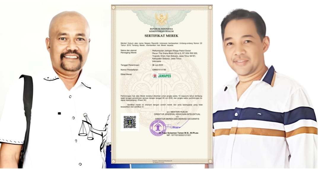Surabaya, locusdelictinews|Lembaga Swadaya Masyarakat (LSM) /Perkumpulan Jaringan Warga Peduli Sosial (JAWAPES) secara resmi mengantongi perlindungan hukum hak cipta atas mereknya setelah Kementerian Hukum Republik Indonesia menerbitkan Sertifikat Merek melalui Direktorat Jenderal Kekayaan Intelektual.