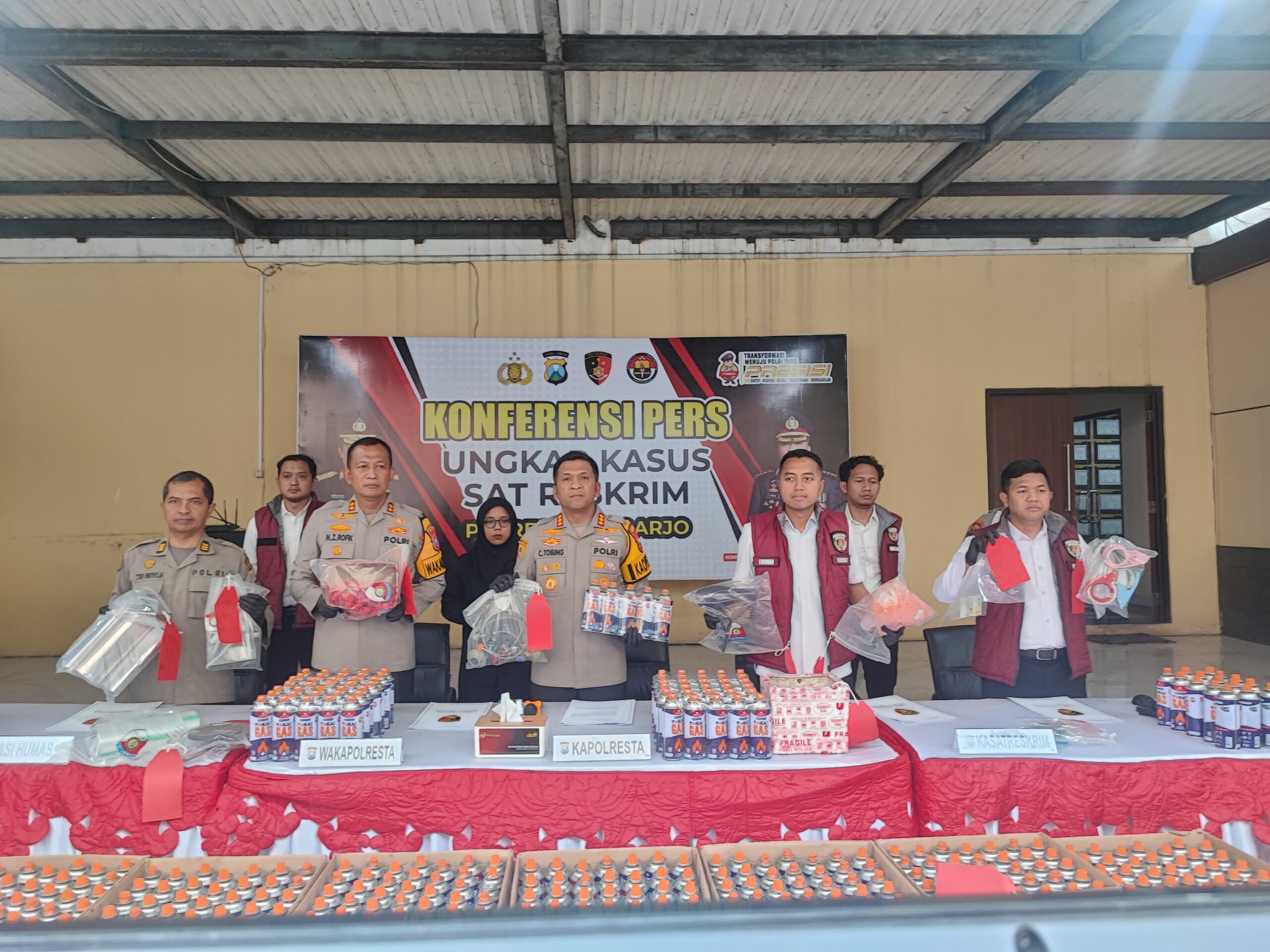 Kapolresta Sidoarjo Kombes. Pol. Christian Tobing mengatakan dalam penggerebekan tersebut, petugas juga mengamankan barang bukti berupa 13 tabung LPG 3 Kg bersubsidi, lebih dari seribu tabung portabel kosong, serta ratusan tabung gas portabel yang sudah terisi.
