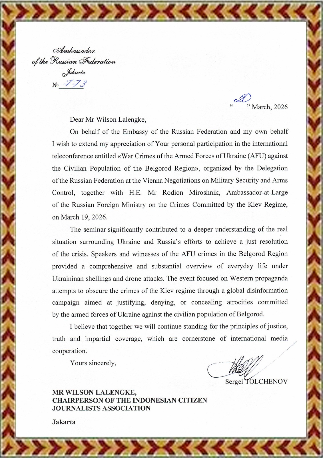 Jakarta,locusdelictinews|Apresiasi datang dari Sergei Tolchenov kepada Persatuan Pewarta Warga Indonesia atas partisipasi aktif dalam forum internasional yang membahas konflik Rusia–Ukraina. Ucapan terima kasih tersebut disampaikan secara resmi melalui surat kepada jajaran pengurus dan anggota PPWI di seluruh Indonesia.