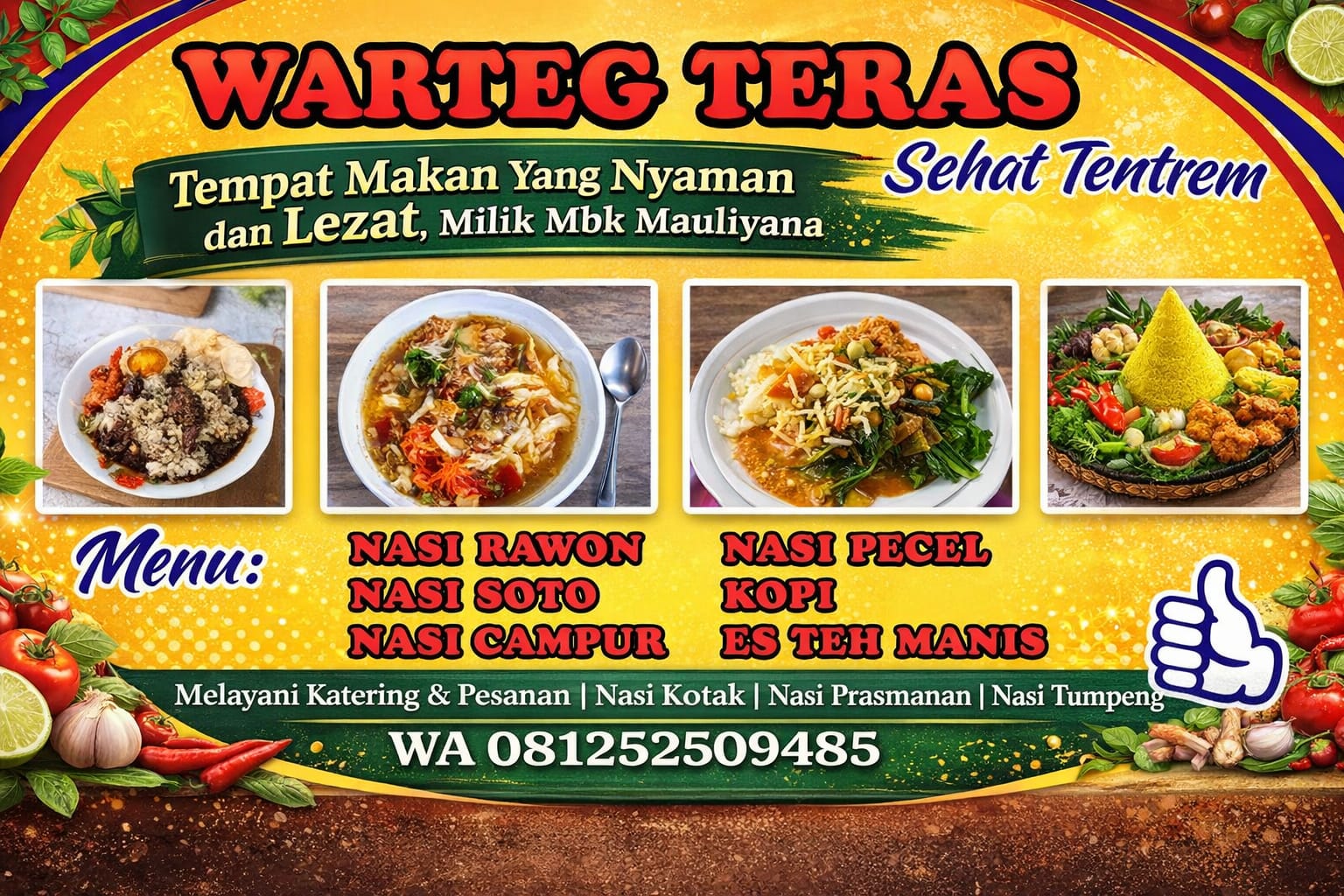 Warteg Teras milik Mbk Mauliyana ini menawarkan berbagai menu pilihan, termasuk Nasi Rawon, Nasi Soto, Nasi Campur, Nasi Pecel, Es Teh Manis, dan kopi.