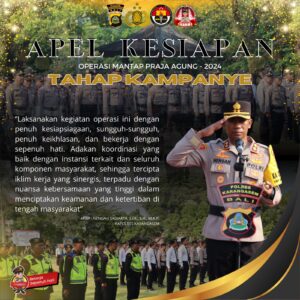 Kapolres Karangasem Pimpin Apel Kesiapan 450 Personel Jelang Pengamanan Tahap Kampanye Pilkada 2024 TNI dan Polri|September 24, 2024by Locus DelictiNews Bali,locusdelictinews – Polres Karangasem menggelar Apel Kesiapan Pasukan Operasi Mantap Praja Agung