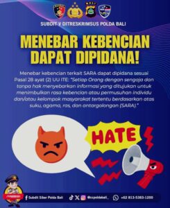Patroli Siber Satgas Ops Cipkon Ingatkan Ancaman Pidana Penebar Kebencian SARA TNI dan Polri|August 5, 2024by Locus DelictiNews BALI,locusdelictinews|Tim Siber Ops Cipkon Agung-2024 dipimpin AKBP Iqbal Sengaji S.I.K., M.Si. Selaku