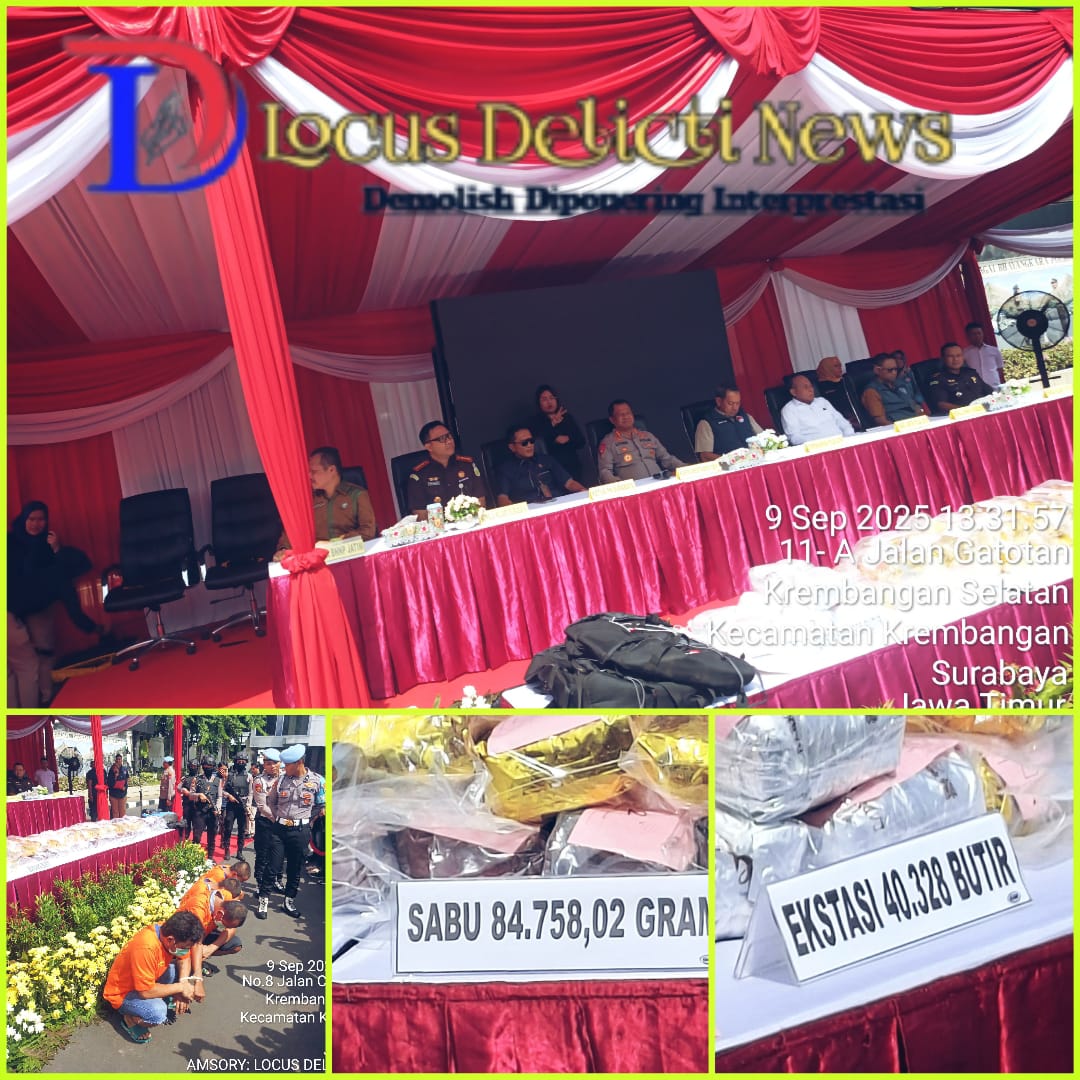 Surabaya,locusdelictinews|Satnarkoba Polrestabes Surabaya kembali menorehkan prestasi besar dalam pemberantasan narkoba. Dalam rangka memperingati HUT ke-80 Kemerdekaan RI sekaligus mendukung Operasi Tumpas Narkoba Semeru 2025, Satresnarkoba Polrestabes Surabaya berhasil mengungkap dua kasus jaringan narkotika lintas pulau dengan barang bukti mencapai 84.758,02 gram sabu dan 40.328 butir ekstasi.