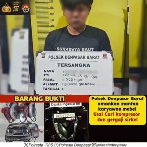 Polsek Denpasar Barat Amankan Mantan Karyawan Mebel Usai Curi Kompresor dan Gergaji Sirkel Hukum Kriminal|January 3, 2025by Locus DelictiNews Denpasar,Locusdelictinews|Unit Reskrim Polsek Denpasar Barat mengamankan seorang pelaku pencurian di gudang mebel