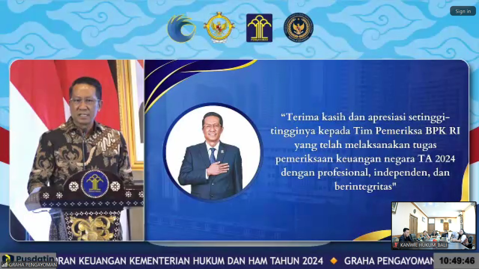 Kegiatan penyerahan Laporan Hasil Pemeriksaan (LHP) atas Laporan Keuangan Tahun 2024 dilaksanakan bertempat di Graha Pengayoman, Jakarta. Dari Bali, hadir secara daring Kepala Kantor Wilayah Kementerian Hukum Bali, Eem Nurmanah, bersama Kepala Divisi Pelayanan Hukum, I Wayan Redana, dan Kepala Divisi Peraturan Perundang-undangan dan Pembinaan Hukum, Mustiqo Vitra Ardhiansyah. Turut mendampingi jajaran Kantor Wilayah Kementerian Hukum Bali, Kantor Wilayah Kementerian HAM NTT wilayah kerja Bali, serta Kantor Wilayah Direktorat Jenderal Imigrasi Bali.